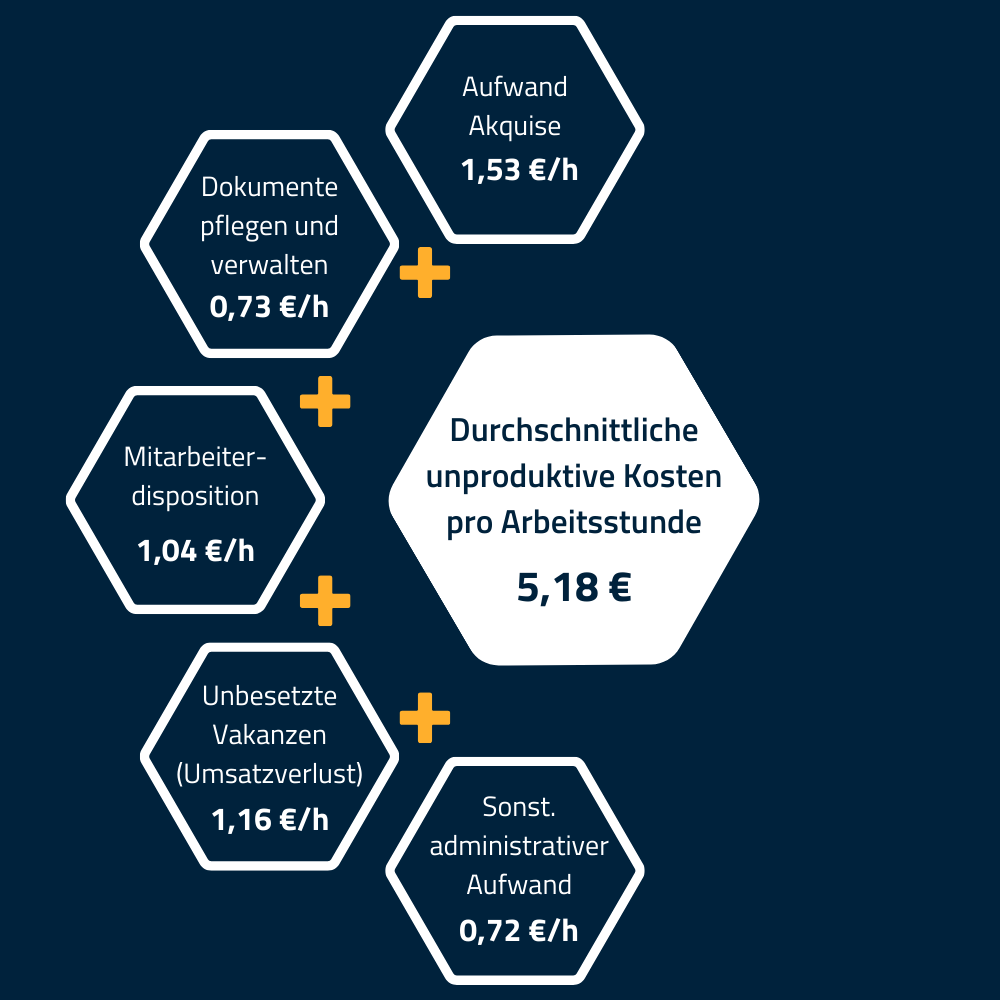 Companies that operate without flextimeHUB work, carry on average 5.18 € unproductive costs per working hour. These arise from time-consuming and administrative tasks such as employee recruitment, scheduling, document management and the loss of turnover caused by unfilled vacancies. These expenses add up to a considerable cost block that reduces efficiency and ties up unnecessary resources.