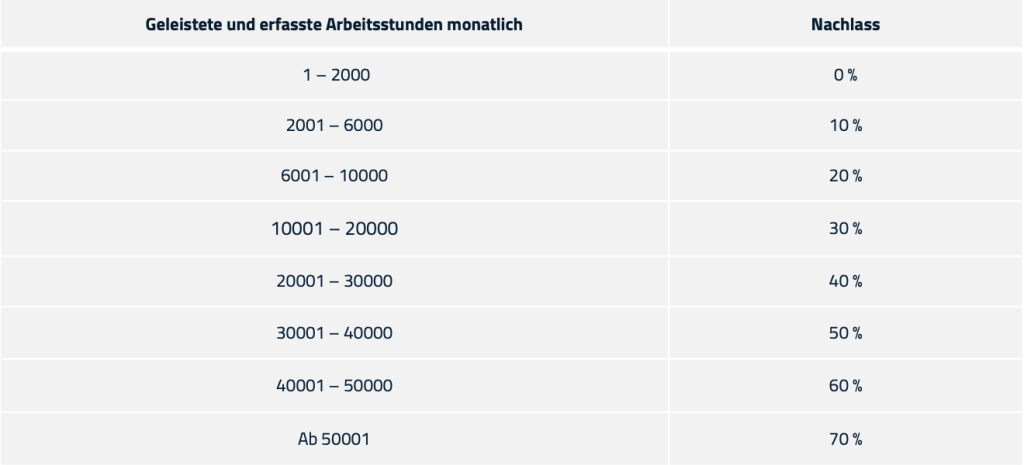 Example: In July, your leased employees worked 25,000 hours, which were recorded by the hirer companies. If you did not perform more than 2000 hours in the previous month, a lump sum of €25,000 is due for the work performed in July. In the following month, your employees work 32,000 hours. Due to the usage-dependent discount from the previous month, you receive a discount of 40% on the hours worked and therefore only pay a flat-rate placement fee of €18,000.